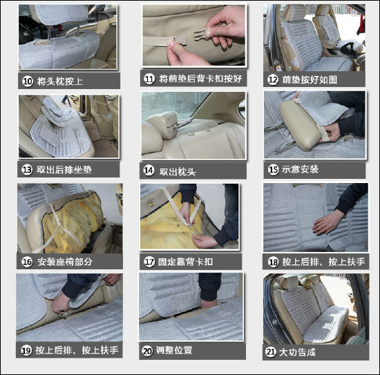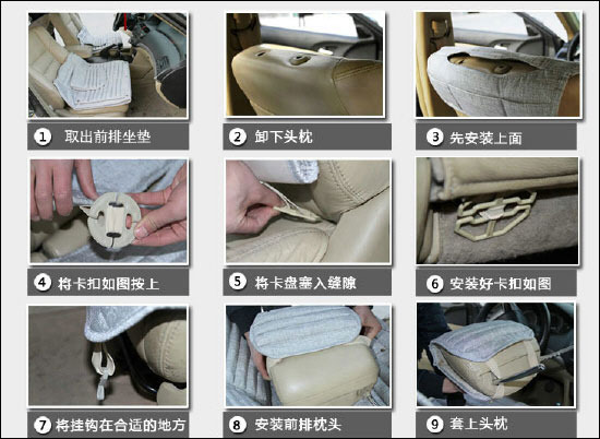 前坐位:先把座位套套在座椅上,并调整好位置(坐位前两角拉开);靠近靠背处有多余的部分及魔术贴和绳子直接沿着缝隙塞到靠背后面,并且把两边绳子尽量往两边底部拉出;座位侧面的绳子用力绑紧,再将魔术贴穿到座位底下前面座位下面两侧有两个工型扣,魔术贴打开来穿过开型扣用力拉紧反粘在白色底面;再将套好的座套整理平整,前座位安装完成。副驾驶座的安装和这个方法一样。