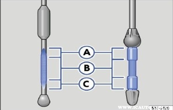 13. 加注机油后发动机机油油位至少位于C 区中间位置。油位可不必超过C 区进入 B 区,但油位绝不允许位于 A区 。