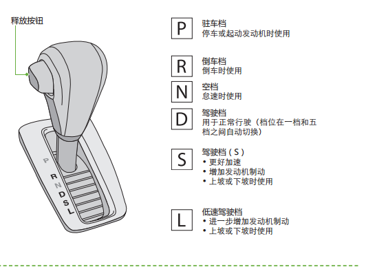 (2)一般挡位在N、D、3挡间切换时不用按换挡按钮,从3挡往下的限制挡上挂必须按换挡钮,从低挡往高挡挂不用按换挡钮。
