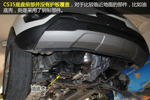 CS35底盘前部并没有护板覆盖,在前悬细节中你可以看到,前副车架为非框式,这就会导致现在发动机下部加装防刮装甲比较困难。这大概都是向成本妥协的结果,毕竟价钱就摆在那里。CS35油底壳采用了钢制部件,在维修成本上较铝合金制品低。没有发动机底板将使得CS35的油底壳暴露在外,增加了油底壳磕碰穿孔的风险。