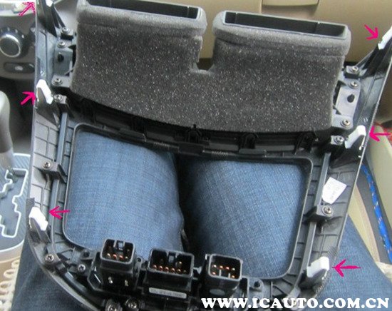 3、将原车面板后面的空调出风口、空调双跳灯开关模块及箭头处6个白色卡子取出装到导航一体机对应位置处。