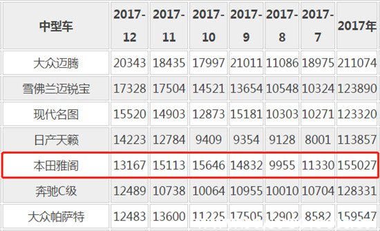去年第9.5代雅阁中期改款车型上市公布的售价为16.98万~23.78万,其中所有雅阁2.0L主销车型价格均进入20万以内售价区间,甚至下探到17万之内,雅阁用实际行动展示了中高级车市场竞争的残酷性。雅阁的价格下探也使其获得了不错的销量数据,2016年雅阁用同比增长6.3%,共销售136,245辆的成绩证明了依旧是中高级车市场的前三。而在2017年上半年,雅阁在上半年猛增33.5%,销量达69,606辆。