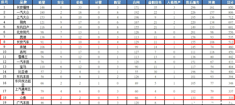 以上J.D. Power的调研数据仅作为参考,并不一定具有统计学意义。那我们不妨来看一看中国消费者协会在2017年受理汽车产品投诉情况而统计得出的排名。长安以绝对多的数量拿到了第8位,这个排名也是自主品牌中最高的,主要投诉集中在质量、合同、售后服务和其他问题。接着是众泰,主要投诉是质量、合同和售后服务。而名爵的表现更好,投诉量不多,并且质量投诉较少,主要投诉是合同和售后服务。
