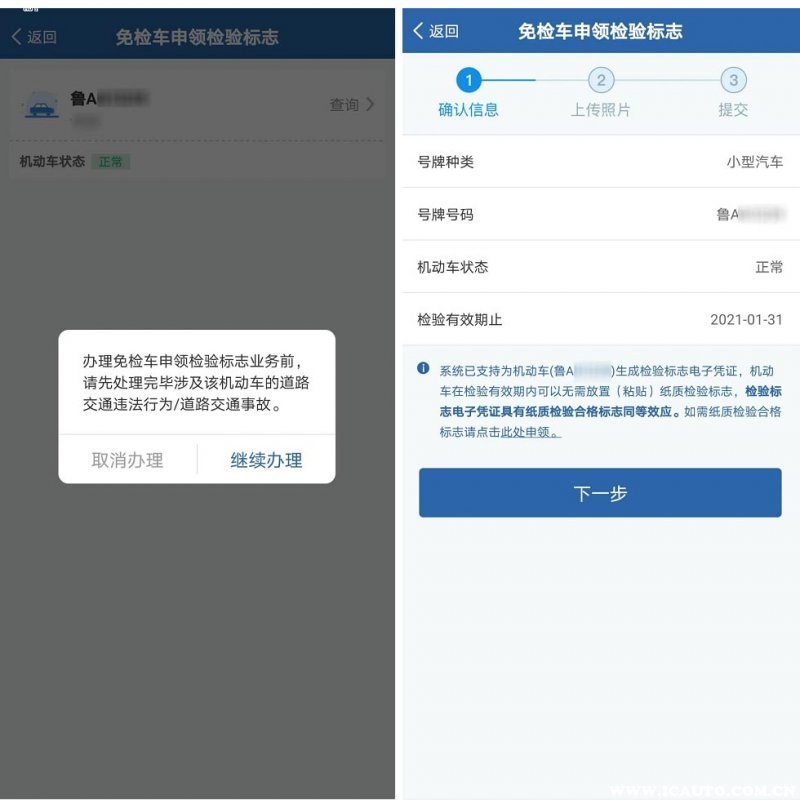 2、提示申领检验标志前,需要处理车辆未处理的违章。点击继续办理,确认信息后,点击下一步;