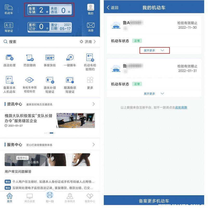 1、打开交管12123App,点击图片所示位置,进入我的机动车,点击展开更多;