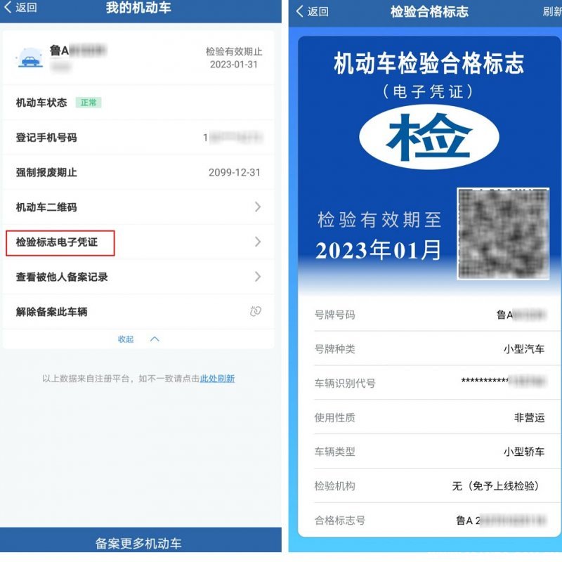 2、点击检验标志电子凭证,即可查看车辆的检验合格标志电子凭证。