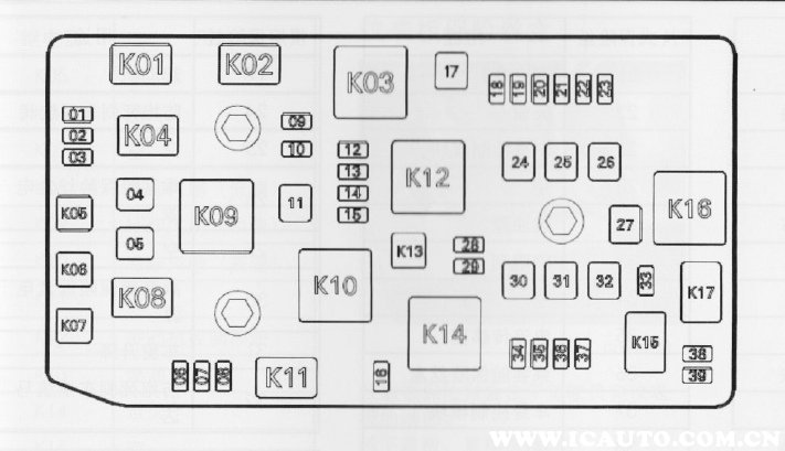 该保险丝盒位于发动机舱驾驶员前部,松开盖子将其拆下。更换有故障的保险丝后,盖上保险丝和盖子,按压使其啮合。如果保险丝盖子未正确盖上,则可能会发生故障。