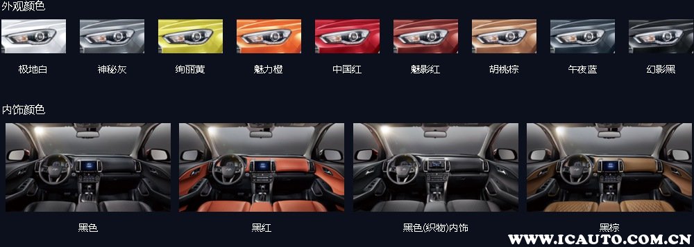 现代ix35的颜色比较丰富,一种有9种颜色可以选择,分别是:极地白、神秘灰、绚丽黄、魅力橙、中国红、魅力红、胡桃棕、午夜蓝、幻影黑。内饰颜色有:黑色、黑红、黑棕。可以根据个人的喜欢来挑选。