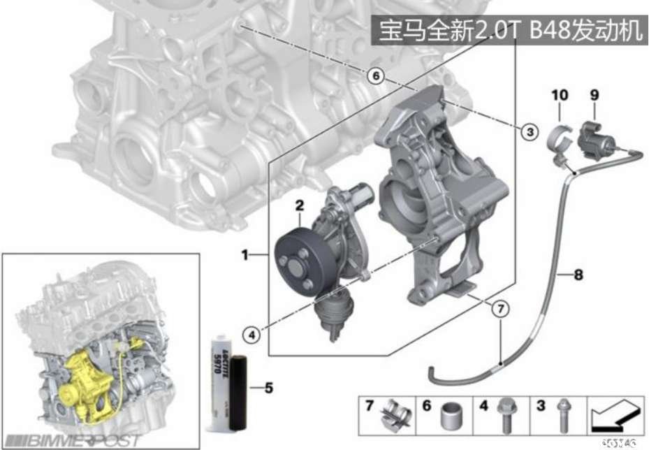 电子水泵:B48的水泵除了有机械结构以外,还有电子控制系统。可以根据发动机的状态实时调整冷却水的流量,从而对发动机的工作温度实现更加精准地调控。