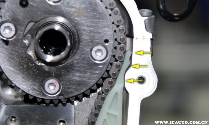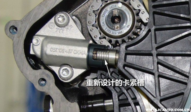 第二代EA888会有正时链条跳齿的情况,原因就是正时链条的张紧轮加力机构的设计不合理,时间长了会松掉导致张紧力不足。此外链条与齿轮的啮合不足也是导致跳齿的一个原因,所以第三代EA888改进了链条的导轨使其更好啮合。