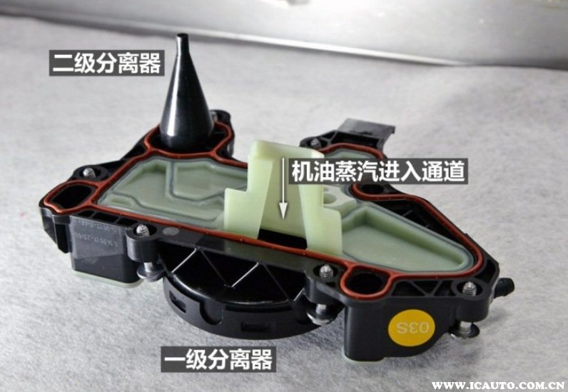 EA888发动机永远离不开的话题就是烧机油,第三代EA888发动机采用了粗分和精分两阶段油气分离,尽量减少机油蒸汽通过进气道进入气缸燃烧。粗分离器集成在气缸体内,采用蜿蜒曲折的管路使大量机油蒸汽冷却重新流回曲轴箱。精分离器在气门室盖上,利用旋转离心力将质量不同的机油蒸汽和空气分开。