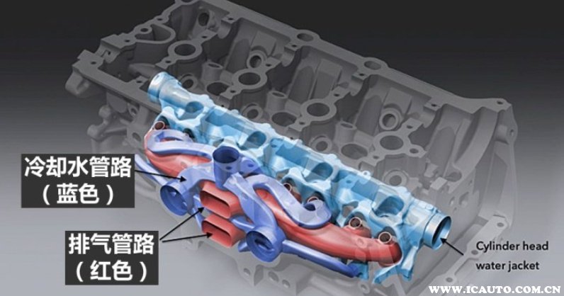 这样设计的另一好处就在于排气管路和缸盖的冷却水管路可以靠得比较近,在冷启动时尾气可以加热冷却水使发动机迅速达到工作温度,反过来冷却水也会带走尾气的热量避免增压器热量过高。
