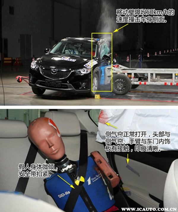 对长安马自达CX-5 2.0L自动舒适型进行碰撞测试,在正面100%碰撞试验中,CX-5的A柱、B柱均无明显变形,发动机舱的溃缩吸能机构起了保护作用。碰撞后安全气囊正常打开,印痕清晰,假人坐姿正常,安全带扣紧,后排儿童座椅也无位移。