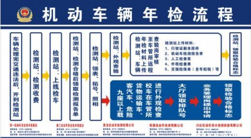 上面有说到,这两种类型的汽车在新车期间是需要一年一检的,在检验有效期到期之前,要到车管所上线检测,并申领检验合格标志,否则将不能继续上路行驶。具体步流程如下: