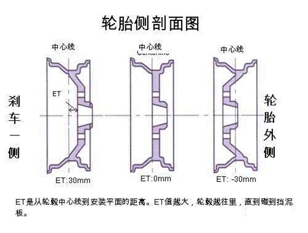 ET值指的是轮毂安装面与轮毂中心线的距离,可以把ET值理解为轮毂的外抛程度,ET值越大轮毂越往内。因此如果所选用的轮毂ET值太小,很容易出现轮毂突出车身的情况。ET值太大,则容易刮到内衬板。