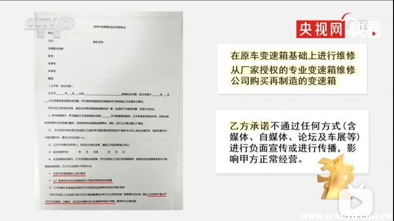 重点是英菲尼迪厂家没有对问题进行召回处理,而是私下与车主签保密协议,要求车主不得找媒体或者自己在媒体上发布相关内容,同时为车主更换后期制造的变速箱,并提供长期质保。而且如果车主闹得比较厉害,质保时间就给长点,闹得不厉害就给短点,实行按“闹”分配。
