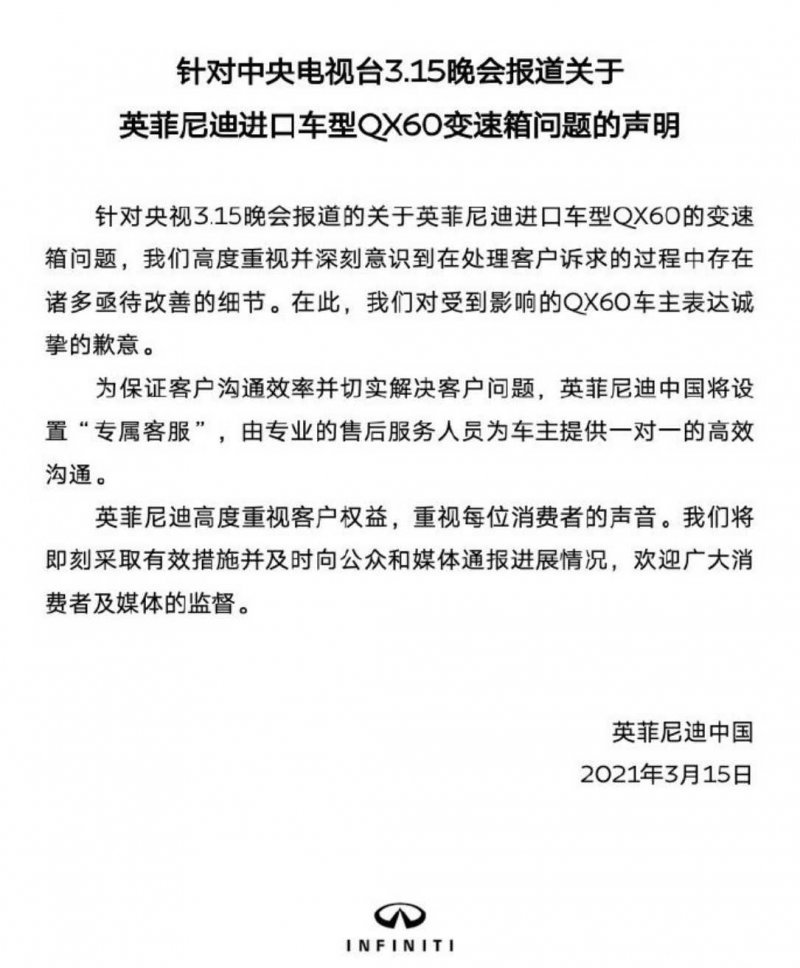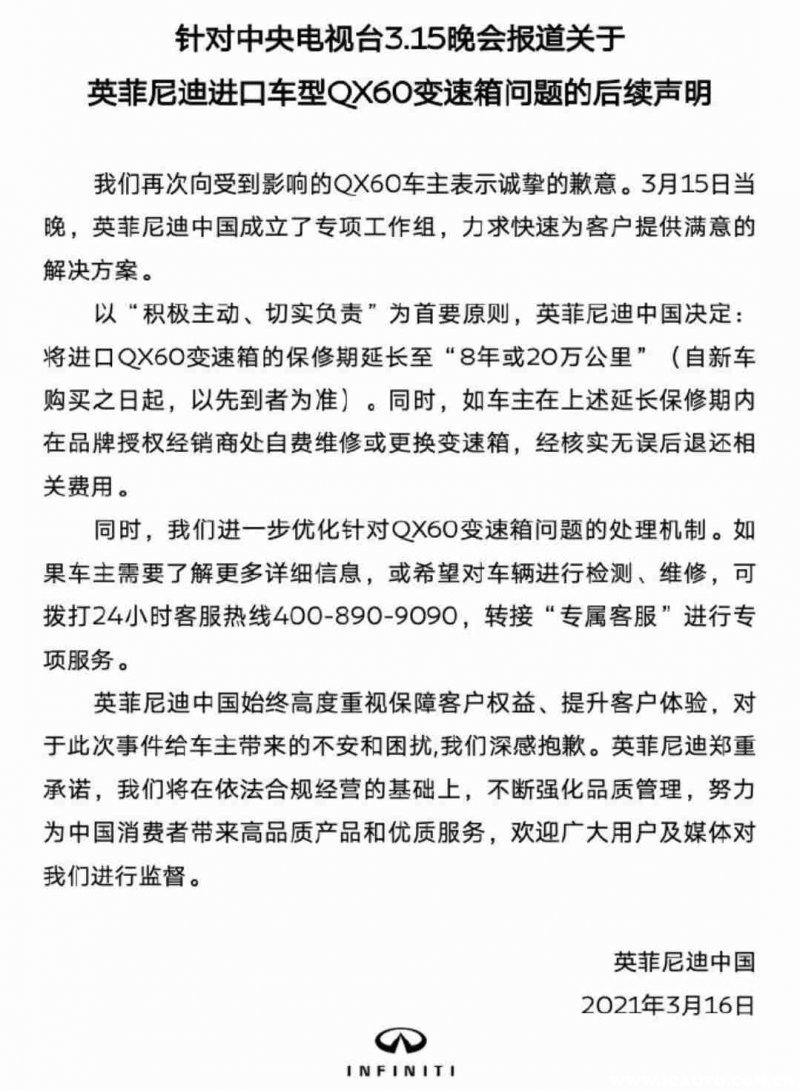 晚会结束后,英菲尼迪陆续发表了两份声明,第一份声明是普通的公关声明,第二份声明应该是晚会后英菲尼迪高层通宵开会讨论,给出的变速箱问题处理方案。