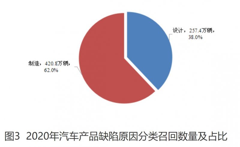 从缺陷原因看,因制造原因召回137次,涉及车辆420.8万辆;设计原因召回62次,涉及车辆257.4万辆(见图3)。