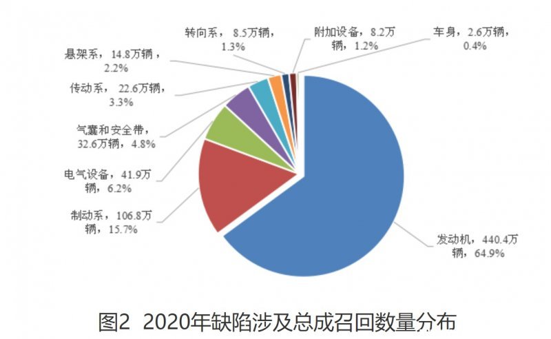 从涉及总成看,发动机、制动系是主要缺陷产生部件,占总召回数量的80.6%。因发动机相关缺陷召回58次,涉及车辆440.4万辆;因制动系相关缺陷召回17次,涉及车辆106.8万辆;因电气设备缺陷召回38次,涉及车辆41.9万辆;因气囊和安全带缺陷召回24次,涉及车辆32.6万辆(见图2)。