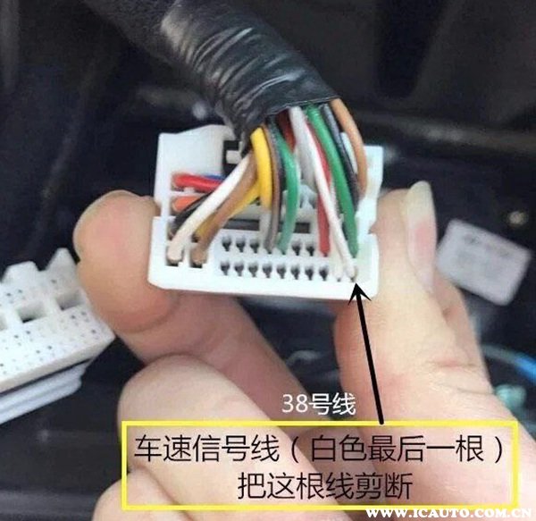 2、把车机中的车速传感线拔掉:车机是靠车速传感线判断车辆是否移动,因此我们可以把车机系统拆下来,随后找到A尾插中的车速传感线,把它剪掉就可以解除行车视频屏蔽(如图所示)