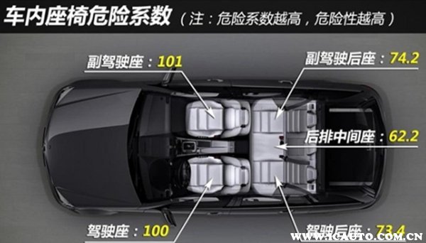 根据美国交通管理部门的调查:如果将汽车驾驶员座位的危险系数设定为100,副驾驶位置的危险系数是101,而驾驶员后排座位的危险系数是73.4,后排另一侧座位的危险系数是74.2,危险系数最低是后排的中间位置,其危险系数为62.2。