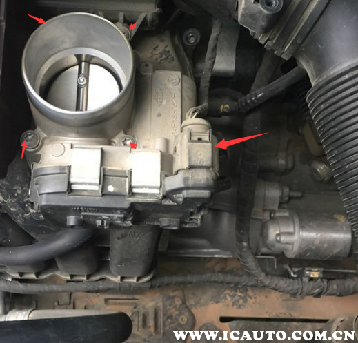 2、扭开节气门总成周围的固定螺丝,拔下节气门插线束;