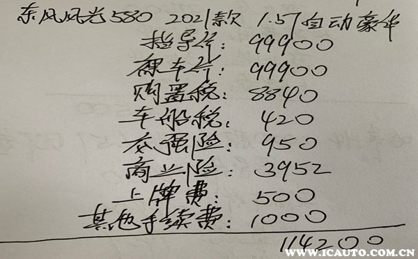 东风小康-风光580 2021款 红星版 1.5T自动豪华型官方指导价9.99万,目前珠海地区没有现金优惠活动,所以这款风光580的实际车价还是9.99万,全款购车包括车辆购置税、交强险、车船税、商业险、上牌费以及其它手续费,最后这款东风风光580落地价11.42万。