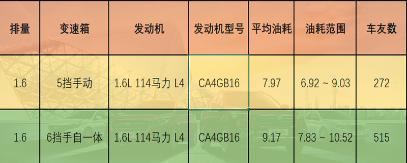 实际油耗方面,通过上表可知,272位5挡手动车型车主的百公里油耗范围在6.92-9.03(L)之间,平均油耗7.97L/100km。515位6挡手自一体车型车主的百公里油耗范围在7.83-10.52(L)之间,平均油耗9.17L/100km。