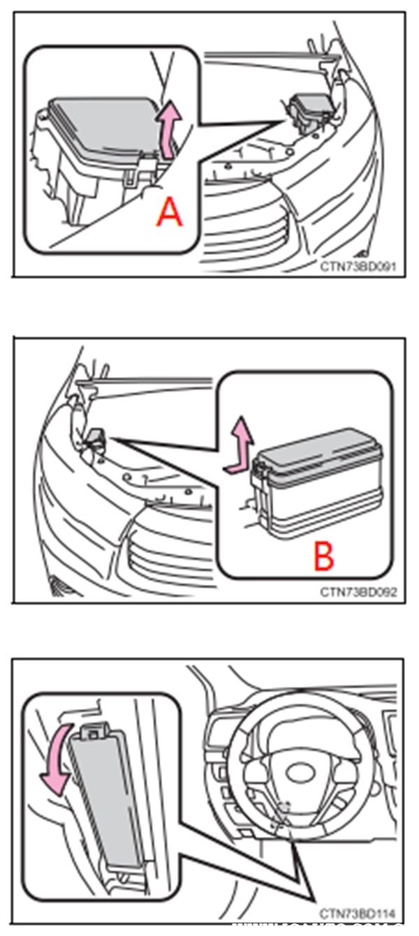 A型和B型保险丝盒都可以通过按入凸舌,然后掀开盒盖。取出保险丝的工具在A型保险丝盒盖上所固定的夹子。如果有任何电气部件不工作,则某个保险丝可能已熔断。如果发生此情况,需进行检查并在必要时更换保险丝。自己进行保养更换保险丝与原装件具有相同额定安培值的保险丝。如果更换的保险丝再次熔断,请联系丰田经销店检查车辆。