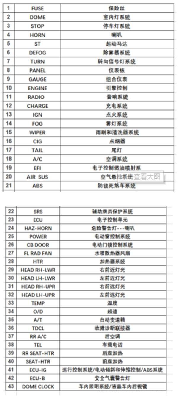 保险丝盒上的英文说明。