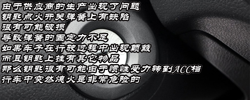 启辰T70召回的原因是有一部分的车子由于供应商的生产出现了问题,钥匙点火开关弹簧上有缺陷,很有可能破损,导致弹簧的固定力不足,如果车子在行驶过程中出现颠簸,而且钥匙上挂有其它物品,那么钥匙很有可能由于惯性受力转到ACC档,行车中突然熄火是非常危险的。