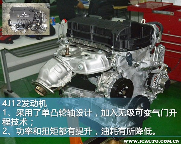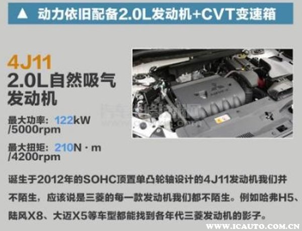 4J12发动机此前为原装进口,目前国产计划也在进行中。与之前三菱的4B1系列发动机不同的是,融入单凸轮轴设计,将进气方式变成无极可变气门升程,发动机的功率和扭矩都有不同程度提供,而且更加节能高效。