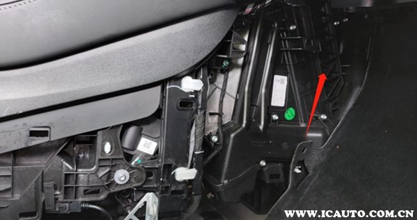 4、拆开之后就是下面这样子,箭头所指的地方就是空调滤芯的位置。