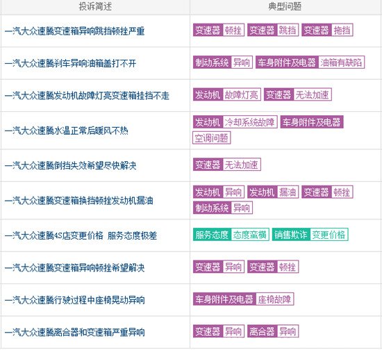 102辆速腾中,出现非人为因素故障的车辆有18辆,但选择维修的只有7辆,这与本刊以往调查车型相比,属于故障率与维修率低占比车型。从首次故障位置来看,可以说较为分散,核心部件也没出现严重质量问题。这个结果与本刊合作媒体车质网近8个月来关于新速腾的二十几例投诉情况基本吻合。投诉涉及问题主要有车窗玻璃接缝不严导致进水,轮胎鼓包,空调无风以及个别座椅松动和车辆抖动、异响等。