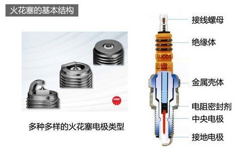 火花塞是由绝缘体和金属壳体两部分组成,金属壳体带有螺纹,拧在发动机气缸上,在金属壳体中有一个中心电极,它通过绝缘材料与金属壳体绝缘,在中心电极上端有接线螺母,连接从分电器的过来的高压线,在金属壳体下面还焊有侧电极,在中心电极与侧电极之间有很小的间隙,脉冲高压电击穿两个电极之间的空气,产生电火花点燃可然混合气做功。