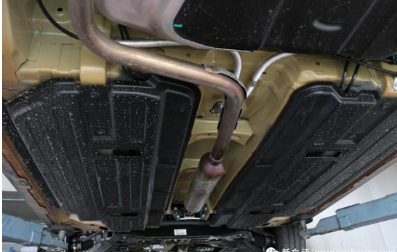 宝骏510在底盘下方用上了两块大面积的塑料板进行覆盖,这在同价位的车型来说确实很少见。这种做法最大的作用就是能减少底盘的乱流,能起到一定降噪和提高车辆稳定性的作用。当然也能对底盘起到一定的防护作用。如下图所示: