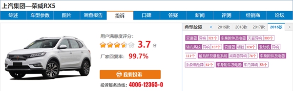 ▲根据车质网16款荣威rx5存在的故障投诉