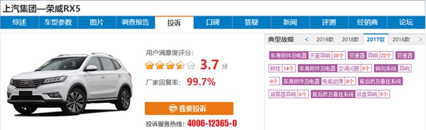 ▲根据车质网17款荣威rx5存在的故障投诉