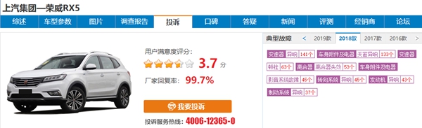 ▲根据车质网18款荣威rx5存在的故障投诉