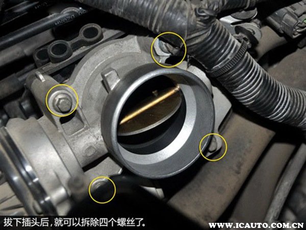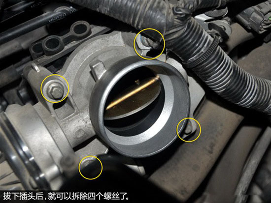 4、节气门一般由四颗螺丝固定在进气歧管上,只需利用工具扭松拆下即可。注意在拧的差不多时要用手接住,避免掉到发动机舱内。