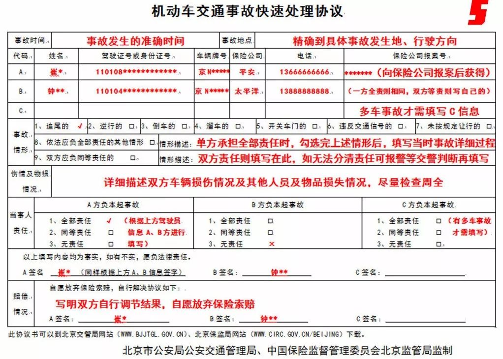 如果是一方全责且车辆损坏不严重的话,那么就要将车挪到不影响交通的地方停好,之后填写《机动车交通事故处理协议书》。没有报警的话手写一个也可以,写明事故发生原因及时间、哪一方的责任、责任方赔偿金额等细节,双方签字即可,避免事后对方找麻烦。