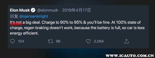 而要保证电动汽车的制动稳定性和平稳性,并尽可能多地回收制动能量,延长电动汽车续航里程。如果你将充电限制为80%,这么能量回收制动功能可以利用制动能量回馈给电池,车辆只要启动就可以得到比80%电量更多的电量。可能是90%也可能95%,但是如果用车之前将电池已经充满到100%,那么在电能消耗到一定程度之前,回收制动系统无法进行能量回收,电池也就无法获得更多电能。这也是马斯克所说的车能源效率利用率低的意思。
