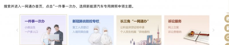 1、搜索并进入一网通办首页,电机“一件事一次办”,选择新能源汽车专用牌照申领主题;