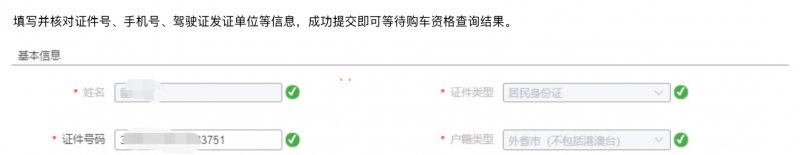 4、填写并核对证件号、手机号、驾驶证发证单位等信息,成功提交即可等待购车资格查询结果;