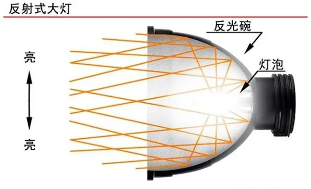 1、反光碗大灯通过使用反射面进行分割,可以实现对路面不同区域的照明。利用折射现象来实现路面的照明,这种方式会造成较大的光损失,并导致亮度下降。