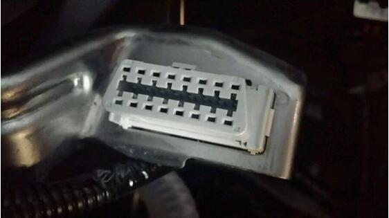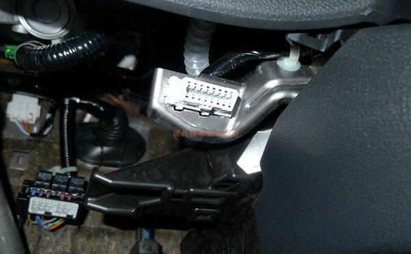寻找有个小窍门,坐在驾驶位,在右腿膝盖下点的位置。白色的接口就是OBD接口: