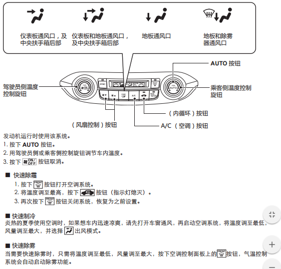 ■ 快速除霜 1. 按下按钮打开空调系统。 2. 将温度调至最高,按下内循环按钮(指示灯熄灭)。 3. 再次按下 按钮关闭系统,恢复为之前设置。 ■ 快速制冷 炎热的夏季使用空调时,如果想车内迅速凉爽,请先打开车窗通风,再启动空调系统,将温度调至最低, 风量调至最大,并选择 出风模式。 ■ 快速除雾 当需要快速除雾时,只需将温度调至最低,风量调至最大,按下空调控制面板上的 按钮,气温控制 系统会自动启动除雾功能。