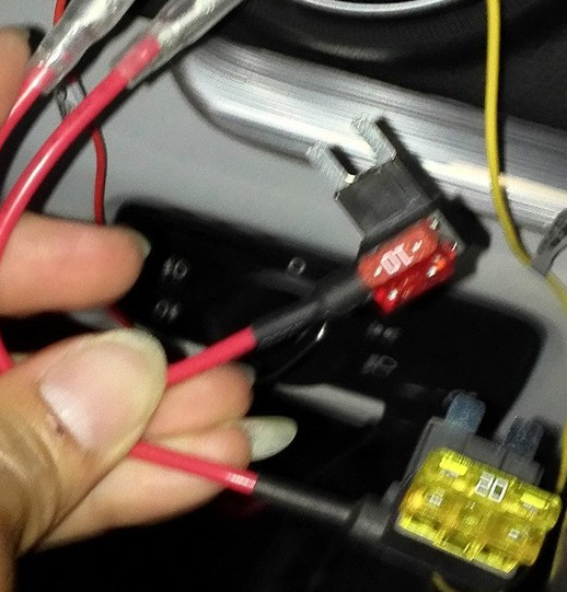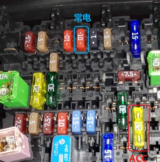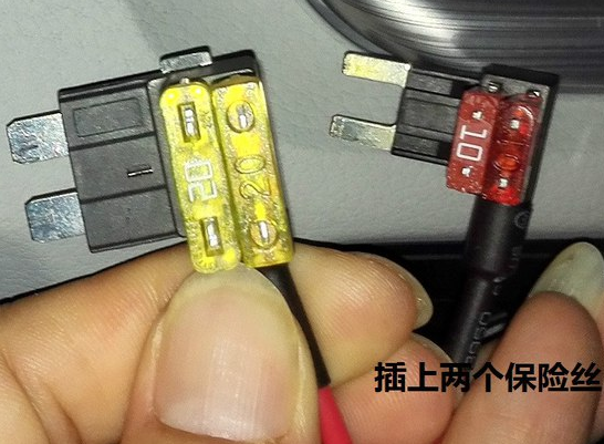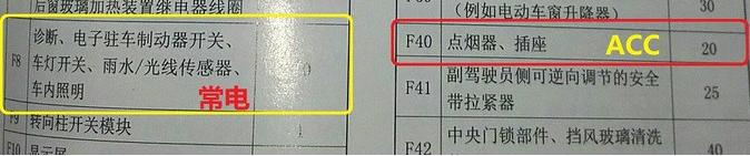 拆完之后,开始安装记录仪,先把主机装上,线从底座的孔穿出来,然后把主机扣好。开始走线,线从顶部内饰板的缝塞进去,跟着原车线束边上走就可以了,走线到保鲜盒,开始接电,用保险取电器来接比较稳妥,保险丝的位置是常电接在10A的F8上,ACC接在20A的F40上。