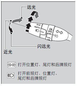 - 丰田卡罗拉远光灯开关图解:灯光开关在方向盘左侧拨杆,转至示宽灯的位置,即可打开示宽灯,尾灯,牌照灯和仪表板照明灯。转动近光...[详细]