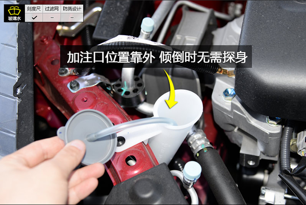 4、只要打开壶盖儿就可以给里边加玻璃水了,日产蓝鸟需要加4升左右。壶里有一个软尺,一边加一边看,到了刻度线就不要加了,加多了容易溢出来,造成不必要的浪费。